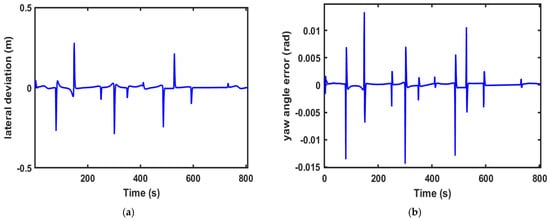 Figure 6, Figure 7 and Figure 8 illustrate the vehicle control results of our proposed control strategy at , , and . The PPO-MPC controller showed excellent performance by effectively adjusting the acceleration and steering angle output within the predefined constraint range, except for some fluctuations at the beginning of the simulation in Figure 8, which quickly stabilized. Figure 6a, Figure 7a and Figure 8a reveal the vehicle’s lateral deviation changes. Large lateral errors may occur where the curvature suddenly changes, and otherwise remain near 0, indicating that the control system has a good ability to keep the vehicle close to the desired trajectory. Figure 6b, Figure 7b and Figure 8b illustrate heading angle error changes, with the maximum value not exceeding 0.05. This shows that the vehicle has good performance in tracking the expected direction. Changes in the yaw rate, as depicted in Figure 6c, Figure 7c and Figure 8c, generally demonstrate low values, suggesting smooth steering operations, mitigated risk of abrupt rolling or sharp turning, and enhanced driving stability. Moreover, Figure 6d, Figure 7d and Figure 8d illustrate speed error changes; even at maximum speed, the speed error for stable operation always remains small, with the error limited within 0.2 m/s.