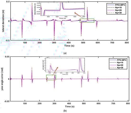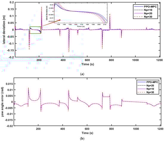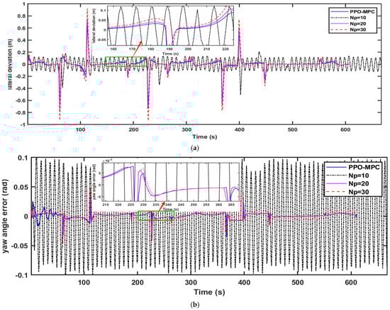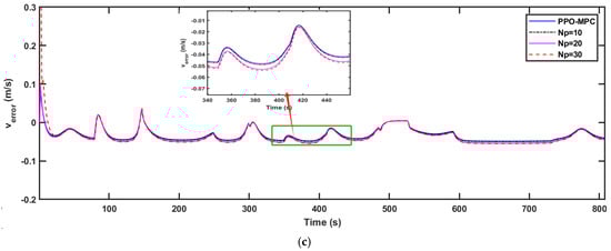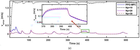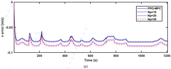 Comparisons of the simulation data are shown in Figure 9, Figure 10 and Figure 11. As shown in Figure 11, it is easy to see that MPC with a fixed range of 10 fails to converge and is unstable at . Figure 9a, Figure 10a and Figure 11a clearly show that compared with MPC with static prediction horizons, PPO-MPC generally has better lateral deviation and exhibits superior trajectory tracking capabilities. The maximal lateral deviation of MPC may even be twice that of PPO-MPC, suggesting that the MPC with fixed prediction horizons may be subject to have greater lateral disturbance or challenges under certain circumstances. Figure 9b, Figure 10b and Figure 11b show that the heading error of PPO-MPC is almost the same as MPC with static prediction horizons at , and the PPO-MPC heading error at is smaller. Moreover, although PPO-MPC jittered at the beginning at , it quickly stabilized and resulted in a smaller heading error. Figure 9c, Figure 10c and Figure 11c show that, except for the jitter that occurs at the beginning of the simulation when , the overall performance of the PPO-MPC speed error is smaller.