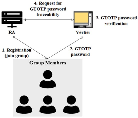 A GTOTP scheme has members , one registration authority (RA) that deals with protocol initialization and group membership registration, and one verifier. Figure 1 illustrates the authentication process of GTOTP, which begins with the users registering with the RA as group members. Subsequently, the group member generates a GTOTP password and sends it to the verifier for authentication. If necessary, such as when the group member provides an invalid GTOTP password or exhibits dishonest behavior, the verifier may initiate a request to the RA for member identity tracing.