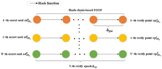 In a GTOTP scheme, each group member generates V TOTP instances for generating TOTP passwords. To prevent linkability between verify points, each TOTP instance has a valid period , i.e., each verify point (or verify epoch) has a validity period of . Figure 2 shows the hash chains used by the group members to generate the TOTP passwords and verify points. The group members compute the secret seed of the i-th hash chain based on the current time and the start time of the GTOTP instance as well as the valid period , then compute the j-th node in the chain as the TOTP password in combination with the password generation interval . This is used as part of the GTOTP password, where and .
