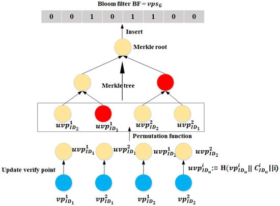 Overview of the process of group member authentication information generation, where , , . The red nodes in the figure represent the Merkle proof of the updated verification point (shown as an example).
