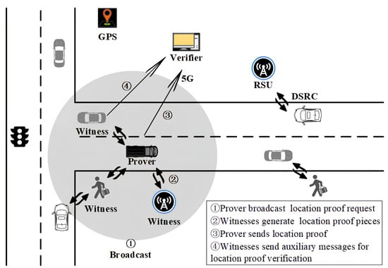 Our PPPoL scheme consists of four entities: the Registration Authority (RA), prover, witness, and verifier. The prover generates a location proof that confirms its presence at a specific location at a specific time. The prover is a user device (such as a smartphone, IoT device, or smart vehicle) that generates a location proof located at a specific location at a specific time. A witness is either a device similar to the prover or a location beacon such as a Roadside Unit (RSU) that assists the prover in generating the location proof based on the location’s proximity to the prover. The verifier may be a location service provider, a government organization, or another entity that needs to verify the location of the prover on the basis of the location proof. The RA manages the registration of the prover, witnesses, and verifier. Figure 4 provides an overview of an outdoor application scenario for the PPPoL scheme. The prover and nearby witnesses obtain location information through GPS and utilize Dedicated Short-Range Communications (DSRC) technology to communicate and generate a location proof. Subsequently, the prover and witnesses transmit the location proof and verification information to the verifier using 5G or other communication technologies.