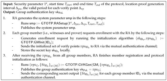 In the initialization phase of the PPPoL scheme, group members, who are either witnesses or the prover, engage with the RA to generate the group authentication key, denoted as . We assume that the communication between RA and entities is secure (using a mutual authentication channel such as TLS []) and that the prover and witnesses communicate with each other over a short-range communication channel such as BlueTooth []. Figure 6 illustrates the detailed process of sub-protocol .