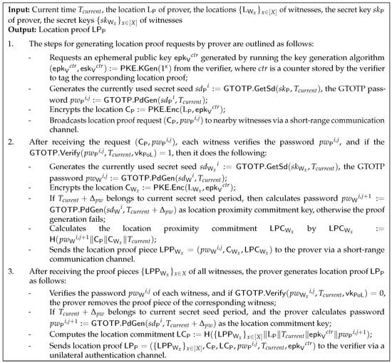In this section, we provide a brief overview of the PoL scheme proposed by Yang et al. [] based on GTOTP. This scheme leverages GTOTP, a privacy-preserving location proximity (PPLP) scheme that runs between the requesting party P and the responding party W to determine whether their locations are proximate, along with a hash-based commitment scheme. The scheme is described below.