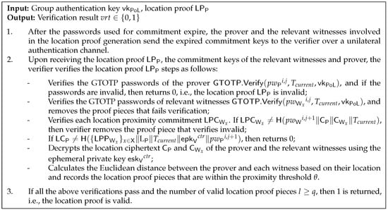 The verifier checks the validity of the location proof using the group verification key and the expired commitment keys of the prover and witnesses, as shown in Figure 8. As the validity of the GTOTP password is short, the prover and related witnesses can quickly send the related expired commitment keys to the verifier for commitment verification, i.e., the verifier can instantly verify the location of the prover. The verifier uses its private key that decrypts the location ciphertext of the witnesses and the prover and calculates the proximity between the locations. If most of the witnesses and the prover are in proximity and if the commitment verification is successful, then the location proof is considered to be valid.