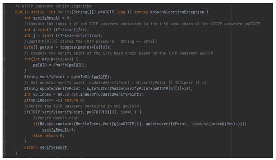 We used SHA256 to implement the hash function in our PPPoL scheme and implemented the effective GTOTP scheme from []; the implementation of PKE scheme used ElGamal encryption []. Figure 10 shows the code of the GTOTP password verification algorithm. The verify points can be used as pseudonyms for group members. Based on the recommended validity of a pseudonym by the European Telecommunications Standards Institute (ETSI), we set the validity of the verify points to min. We considered the selection of parameter values based on previous PoL and GTOTP schemes and the GTOTP password generation interval s; thus, each TOTP instance consisted of one-time passwords. We set the proximity threshold in our PPPoL scheme to m, and the verify points of all members were divided into subsets. Unless otherwise specified, we set V = 105,120, which is enough to run our PPPoL for a year. We set and . Of course, these parameters could be set to other values; however, as the selected test values have been previously validated in the existing literature [] and are sufficient to demonstrate the feasibility of our scheme, we did not perform testing with other parameter values.