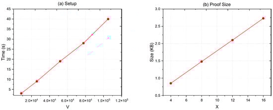 Proof Size. Each hash value takes 32 bytes, a timestamp takes 8 bytes, each location cipher C takes 64 bytes, and an ephemeral public key takes 64 bytes, for a total proof size of bytes. Figure 11b shows that the proof size grows linearly with X when fixing V. It can be seen that the proof size is less than 3 KB even when , which is practical.