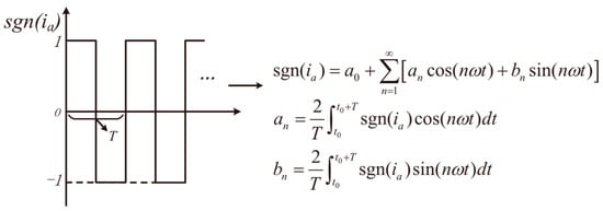 Since the sign function of the input current is a periodic rectangular wave, it can be converted into the form of a triangular series summation, as shown in Figure 2, where a0 is the DC components, and an and bn are the coefficients of the sine and cosine terms, respectively.