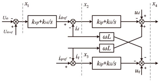 where x1 to x3 denote the state variables; k1 = kvp, k2 = kvi, k3 = kip, k4 = kii, udc indicate DC-side voltage; and id and iq indicate the dq-axis current.