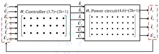 In conclusion, the HSS model of the topology is represented by Equation (13), and the controller HSS model Equation (24) can be connected, as shown in Figure 6.