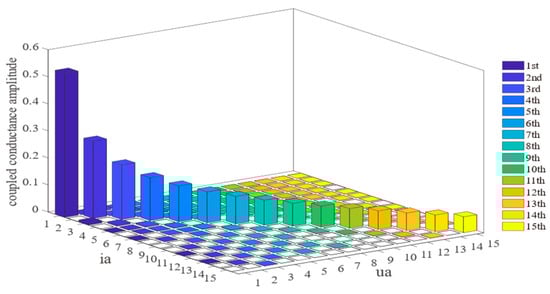 It is important to note that, in practice, there may be coupling relationships for more than just nth-order input voltages for mth-order inputs. These relationships may result from the product of the Fourier coefficients of the input variables and the harmonic transfer coefficients (frequency-domain values) at several different frequencies. When h = 15, the coupled conductance amplitude diagram of the AC-side voltage Ua and current Ia can be obtained as shown in Figure 7.