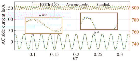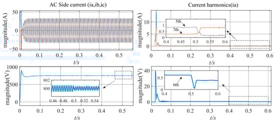 To validate the accuracy of the proposed model, extensive testing is conducted. A 20 V 5th harmonic voltage perturbation is applied to the grid side. The a-phase current waveforms of the AC side under this condition are shown in Figure 8.