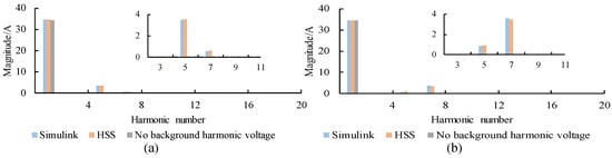 In order to quantitatively analyze the error between the mathematical model and the simulation model, two different working conditions are established to enhance the verification process. The fifth negative sequence voltage and the seventh positive sequence voltage, each with an amplitude of 20 V, are injected into the grid side. The simulation model and the HSS model provide calculated values for the amplitude of each harmonic of the grid-side current, as shown in Figure 9. It can be seen that the amplitude of the harmonic currents calculated by HSS after the introduction of the perturbation is closer to that obtained by Simulink. This demonstrates the advantage of applying HSS to harmonic analysis and highlights the reliability of the modeling.
