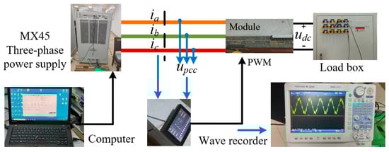 To validate the HSS model from a practical perspective, this paper constructs an experimental platform that includes the Vienna rectifier, as shown in Figure 11. The MX45 three-phase power supply is utilized to power the test module. The module adopts constant DC voltage control, and its output voltage can be set at 200–750 V. The output of this module is connected to a load box comprising several 50 Ω/5 kW resistors connected in series and parallel. The AC-side current is measured using a wave recorder. It is possible to set the fundamental frequency and the harmonic amplitude of the three-phase power supply output by connecting it to the host computer.