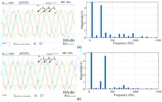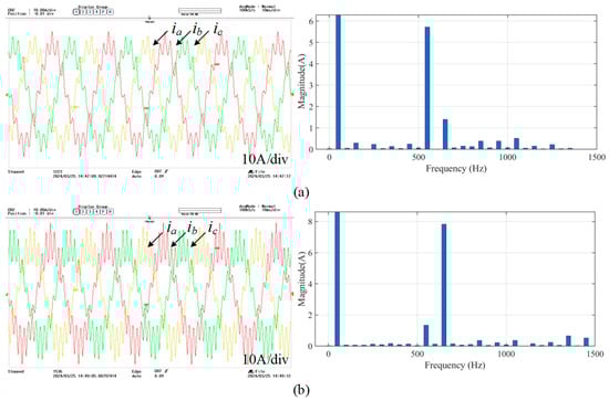 In order to further verify the consistency of the experimental results, two additional sets of tests were conducted to inject 11 negative-sequence voltage disturbances and 13 positive-sequence voltage disturbances. The resulting three-phase current waveforms and the FFT analysis of the corresponding single-phase currents are illustrated in Figure 15.