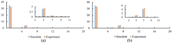In order to further elucidate the findings, the simulation results are compared with the experimental data. The comparison of the amplitude of each harmonic current between the simulation model and the experimental results under the above two specified working conditions is illustrated in Figure 14. It can be observed that, despite a slight deviation between the two results, the consistency of the law can still be reflected to a certain extent. The difference between the two results may be attributed to the idealization of the components in the simulation model, errors in the FFT analysis, and other factors.