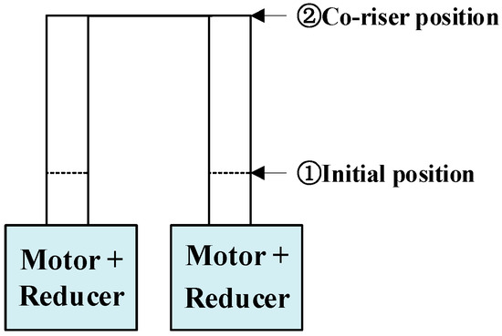 The angle-of-attack conversion component in the lifting wing is crucial for determining the wing’s angle of attack. This component achieves synchronized reverse movements through the use of motor-driven electric actuators. The structural configuration is illustrated in Figure 1. For precise synchronization, both motors must rotate at identical angles simultaneously, driving the electric actuator to ascend or descend. The input angle of attack of the system guides the calculation for the required height adjustment (rise or fall) of the two electric actuators. Subsequently, the two motors perform forward or reverse rotations at specific angles, effectively controlling the ascent or descent of the electric actuator. Operational schematic diagrams are presented in Figure 2 and Figure 3.
