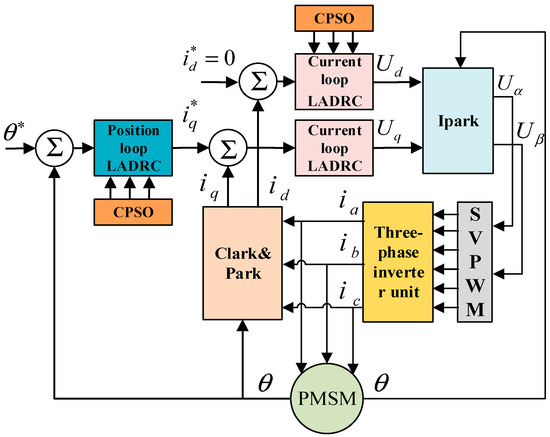 The motor control method employed in this study is the position-current double-loop LADRC control, complemented by the CPSO for tuning the control parameters. Compared to traditional three-loop control, this method ensures position control accuracy and integrates the speed and position loops into the LADRC position loop. This integration not only simplifies the adjustment of control parameters but also enhances the immunity and response speed of the system.