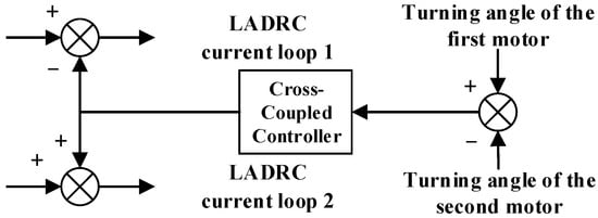 To attain synchronous operation between the two motors, a cross-coupling control structure was selected due to its high suitability for synchronizing two motors. The fundamental principle of this structure involves compensating for any position or speed differences between the motors in the input of the controller, thereby achieving coupling of the motor angle, speed, or current. This study utilizes a structure designed to compensate for the position differences among the motors within the current loop. The first motor is subjected to positive feedback, whereas the second motor receives negative feedback. Such an arrangement guarantees consistency in the positions of both motors, thereby enabling synchronous operation. The structure is illustrated in Figure 16.