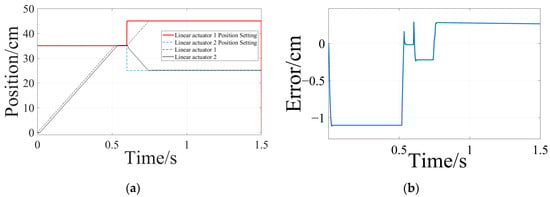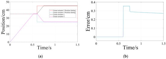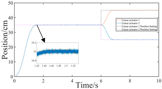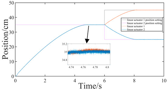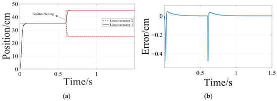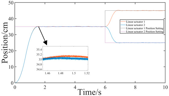 To verify the system’s immunity and synchronization performance, experiments were designed as follows: The distance between the two electric actuators was set at d = 150 cm, the height at h = 35 cm, and the angle of attack at = 15°. Subsequently, different inputs were administered to the two motors at distinct positions. Initially, the two motors are synchronized to start both under no load and an asymmetric heavy load (with loads of 5 N·m and 30 N·m, respectively), aiming to simultaneously reach a height of h = 35 cm. At = 0.6 s, position signals were set for electric actuator 1 and electric actuator 2 at == 10 cm to observe the effects of reverse synchronization. Figure 17, Figure 18, Figure 19, Figure 20, Figure 21 and Figure 22 depict the simulation results.