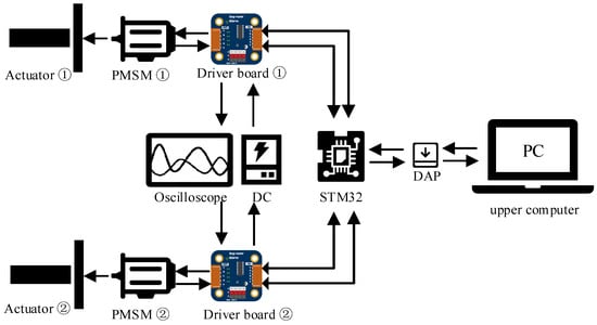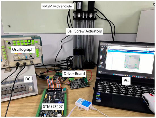 The optimized algorithm was uploaded to the STM32 control board using Data Acquisition Processor (DAP). The STM32F407 is interfaced with two drive boards, facilitating parallel control of two motors. The power supply circuit utilizes a common DC bus structure. Notably, the two motors are directly coupled to the lead screw without mechanical coupling, effectively eliminating interference from mechanical coupling effects. The position information of the motor is captured through a 20-bit high-resolution single-turn absolute encoder. Considering the proportional relationship between the position of the electric push rod and the angular displacement of the motor, the encoder-relayed motor position information undergoes positional data processing via the Digital-to-Analog Converter (DAC), facilitated by the STM32, before being displayed on the oscilloscope. The experimental setup is illustrated in Figure 24. The inverter utilizes Insulated-Gate Bipolar Transistors (IGBTs) and functions at a switching frequency of 16 kHz. Comprehensive details of the motor parameters are presented in Table 2.