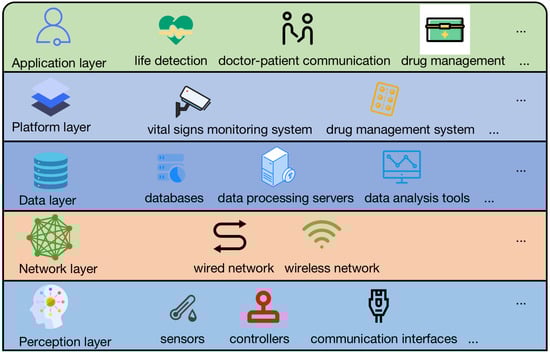 The Internet of Things can connect any item to the Internet. It uses information-sensing devices such as radio frequency identification and infrared sensors to transmit data and communicate according to specific protocols, thus realizing intelligent identification, positioning, tracking, monitoring, and management functions [,,]. As shown in Figure 1, as an application of Internet of Things technology in the medical field, IoMT [] can closely connect medical staff, patients, and various medical devices to achieve real-time feedback on patient health status. It not only improves the speed of medical response and provides all-weather medical care but also alleviates the workload of medical staff. IoMT improves the precision and convenience of medical work, leading to a better quality of medical care. IoMT also plays a significant role in saving lives, helping to control costs, and improving efficiency.