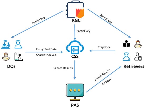 There are five core entities involved in the new scheme: the key generation center (KGC), the data owners (DOs, including patients and their doctors), CSSs, retrievers (e.g., authorized doctors or hospitals), and a private audit server (PAS), as shown in Figure 2.