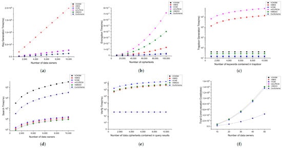 In the Search algorithm, the computational overhead of the VCKSM [] scheme and our scheme is affected by n and m, while the other schemes are only affected by n. In Figure 3d, for ease of discussion, we assume and evaluate the computational burden of the Search algorithm by varying the number of data owners from 1 to 10,000 (). It can be seen that the computational overhead of all schemes almost always increases with n. Note that the computational overhead of the VCKSM [] scheme with our scheme in the Search algorithm is slightly higher than that of the other schemes, which are roughly equal.