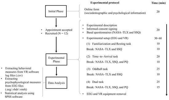 The experimental phase was expected to last around three hours for each volunteer. Initially, 20 min was dedicated to explaining the experiment, obtaining informed consent, and administering the SSQ and NASA-TLX questionnaires to gather baseline measures. The following 30 to 60 min involved the experimenter fitting the EEG cap onto the participant’s head. This process included accurately placing electrodes at specific sites, ensuring their impedance was correctly measured and adjusted, and fitting the VR headset over the EEG cap (please refer to Figure A1 in Appendix B for a visual guide and Section 2.2 for technical equipment details). Following this setup, participants engaged in VR-based behavioural tasks for approximately 90 to 120 min, including 10 min breaks after each task to allow rest; removal of the HMD; and completion of the PQ, SSQ, and NASA-TLX questionnaires as required.