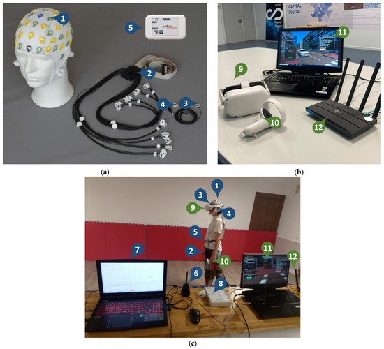 The EEG and VR equipment: (a) Main components of the EEG recorder kit; (b) Main components of the VR equipment; (c) The final setup worn by participants during the experiments. Readers may refer to Table 1 for the description and numbering of components.