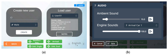 Interfaces within the VR application: (a) Main interface to create/load users and select a trial scenario; (b) Interface for customizing audio files (ambient and engines).