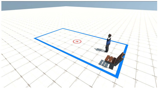 Throughout the configuration steps, users wear their HMD and experience a virtual, blank scenario depicting the center and dimensions of the calibrated, obstacle-free play area (see Figure 4). They are allowed to move across this space to get acquainted with the virtual world. Should users approach any of the boundaries, a blue grid wall appears, visually signaling their proximity to the calibrated area’s limits. Moreover, a virtual bench occupies one corner, precisely mirroring the position of a physical chair within the room. This chair serves as a resting spot during a designated task within the experiment (see Section 2.4.1).