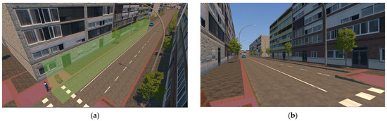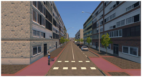 The developed scenario realistically portrays a typical urban crossroad in Madrid. It features a two-lane road accommodating bidirectional traffic flanked by pedestrian sidewalks, as shown in Figure 5. The scenario is composed only of static elements such as buildings, trees, parked vehicles, and benches (for use during rest periods), deliberately excluding dynamic components like moving pedestrians or vehicles to minimize distractions. Moving vehicles were introduced when the protocol for a correct task execution was required. The scene is set under sunny weather conditions to minimize the shadows cast by any urban elements on the asphalt. The light’s color temperature is set at 4500 K, slightly warmer than Unity’s default temperature of 6570 K, to achieve a better sense of dominance of the virtual environment [40].