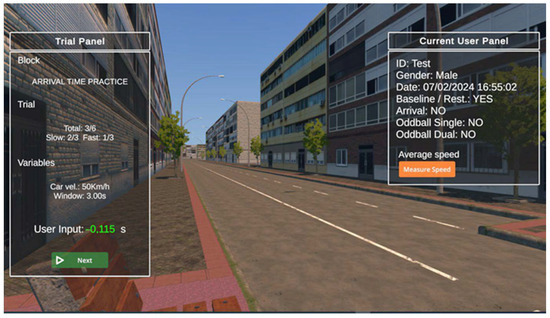 The experiment manipulates four distinct conditions by varying the vehicle’s speed and the timing of its disappearance (i.e., for how many seconds it remains invisible until it reaches the user), following previous studies [3,32,34,45,46]. Therefore, each of the two variables presents two discrete levels: speed at 30 km/h and 50 km/h and disappearance time of 3 s and 5 s. The levels of each variable have an equal probability (50%) of being drawn. Trials are configured to display one of the potential combinations of these variables, arranged in a randomized sequence. The duration of each trial ranged from 10 to 15 s, depending on the assigned speed condition. Notably, the vehicle did not become visible immediately upon reaching the participant’s position but reappeared 2 s later. The reason for this delay was to ensure that the psychophysiological measurement corresponds to the anticipation of the vehicle’s arrival rather than its reappearance. Furthermore, it allowed the recording of longer-duration evoked potentials without potential interference.