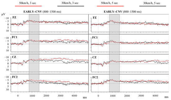 To investigate the characteristics and differences of the Early-CNV component across various conditions, we employed a repeated-measures analysis of variance (RM-ANOVA). The analysis focused on two primary factors: the electrode site (FZ, FC1, FC2, and CZ) and the experimental conditions, whose resulting four distinct scenarios have been coded as 33 (speed at 30 km/h with the car disappearing at 3 s), 35 (speed at 30 km/h and 5 s of disappearance time), 53 (50 km/h and 3 s), and 55 (50 km/h and 5 s). Factors and factor interactions were accepted as statistically significant at p < 0.05. The effect size for the ANOVA was reported using partial eta squared (eta) to quantify the magnitude of observed phenomena. When the sphericity criteria were violated, Greenhouse–Geisser correction was applied. A Pearson correlation analysis was subsequently applied to explore the statistical relationship between EEG data and behavioral outcomes.