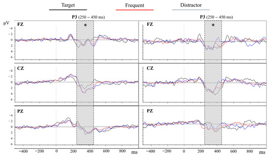 Dual tasks involving motor and attentional activities with high cognitive demand induce cognitive–motor interference (CMI), thereby impairing behavioral performance (the number of errors, walking speed, or response times) and altering neural activity patterns associated with attention and perception [24,25] One of the most employed paradigms to create situations of high dual demand combine walking with a cognitive task of visual Oddball or target stimulus detection. In these paradigms, subjects are required to identify the appearance of a target stimulus (the oddball) while inhibiting their response to a distractor or irrelevant stimulus [24,25,26,27,28,29]. During this attentional activity, a P3 Event-Related Potential (ERP) component is obtained, which can be observed as a positive deflection in the EEG signal occurring in medial areas of the cerebral cortex approximately 300 ms after the onset of a relevant event. Given the distributed nature of neural events underlying P3 generation across callosal fiber tracts from the frontal to the parietal lobes [30], attention-related electrical activity within these cortical regions is typically assessed using electrodes positioned at FZ, CZ, and PZ sites on the midline scalp. Therefore, the observation of the P3 component during oddball tasks is associated with effective attentional processing toward a relevant event [27,28]. In dual tasks (oddball and walking), CMI has been observed, correlating with a reduction in the amplitude of P3 (in terms of μV) during tasks performed in motion compared to the same task in a static condition. This decrease in amplitude may be interpreted as an indication of the heightened utilization of cognitive resources required for the efficient execution of the attentional task [25,28].