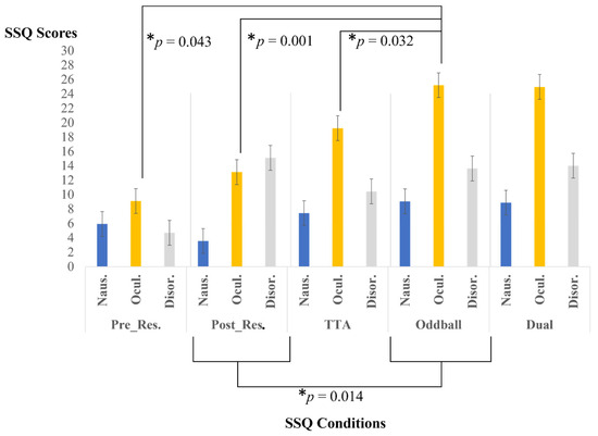 Discomfort symptoms associated with VR, such as dizziness, nausea, and vertigo, were systematically assessed at designated intervals utilizing the Simulator Sickness Questionnaire (SSQ). This questionnaire gauges participant responses on a 4-point scale (0–3) for 16 symptoms of discomfort, which are organized into 3 categories: Oculomotor (O), Disorientation (D), and Nausea (N). In this case, Cronbach’s alpha score achieved a value of 0.87. Scores for each category were calculated by summing the responses for related symptoms, with elevated scores reflecting greater discomfort levels within each category. The questionnaire and formulas employed to assess participants’ discomfort are detailed in [38].