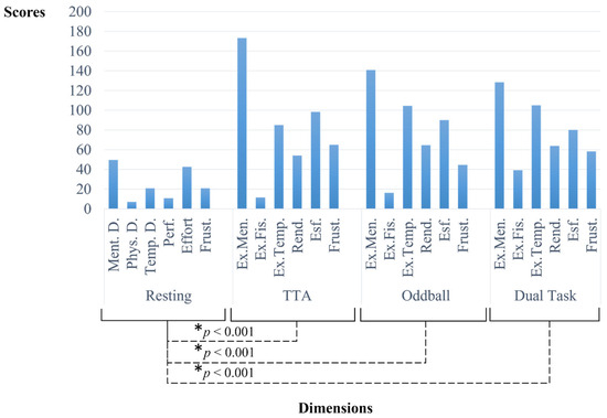 The subjective mental workload was evaluated utilizing the NASA Task Load Index (NASA-TLX) questionnaire [37] in its validated Spanish adaptation [50]. The implementation of this questionnaire necessitated an initial baseline measurement phase, during which the subject’s expected level of demand was established across the six evaluated dimensions: mental demand, physical demand, temporal demand, performance, effort, and frustration. Participants were asked to rate the perceived importance of each dimension on a scale from 0 to 20 immediately after completing their tasks. Detailed descriptions of each dimension were provided, guiding participants to compare them in pairs and identify which they perceived as contributing more significantly to their workload. In the original version, the mentioned dimensions and the overall scale exhibited an internal consistency level of 0.69, calculated with Cronbach’s alpha coefficient. The comprehensive mental workload score, calibrated on a scale up to 100, was derived by calculating the weighted mean of the aggregated scores across these six dimensions. Higher scores were interpreted as indicative of an elevated perception of mental workload.