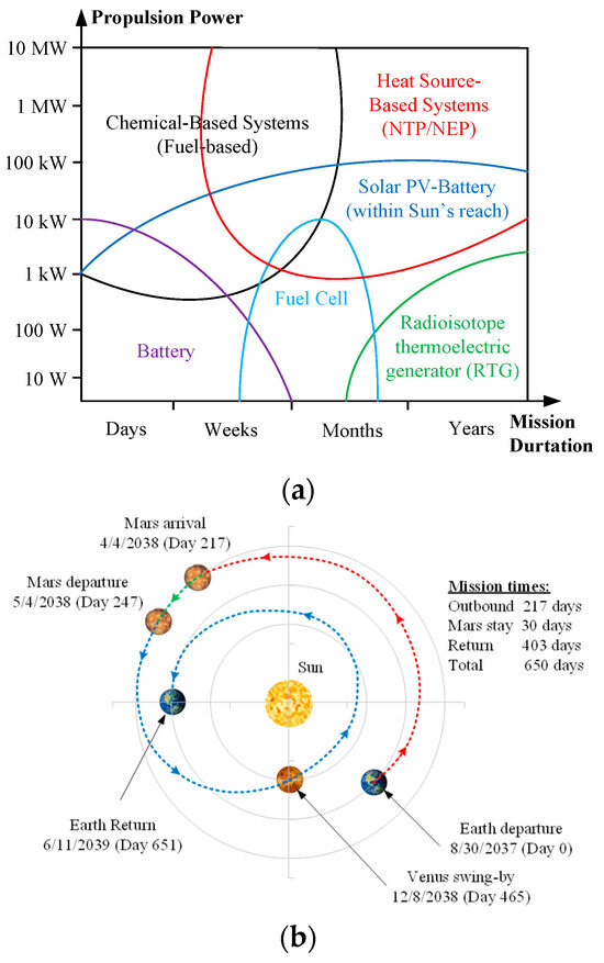 Spacecraft power and Mars travel path: (a) Paradigm of spacecraft propulsion power vs. mission duration.; (b) Mars travel design path.