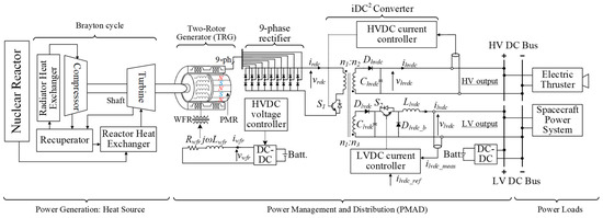 Figure 2 shows the architecture of the proposed EP scheme, where a heat source (combined NEP reactor, Brayton cycle, and turbine) acts as a prime mover rotating at a fixed speed and spinning a nine-phase two-rotor generator (TRG) whose output is rectified using a nine-phase bridge rectifier. The rectified voltage is then connected to the spacecraft HVDC bus using an isolated dual output DC-DC (iDC2) converter. The thermal energy released from a nuclear reactor is converted into electrical power for propulsion and the spacecraft power system. In this system, the reactor heat exchanger transfers heat from the reactor to a working fluid circulating in the cycle, while the turbine extracts mechanical work from the expanding fluid. The recuperator recovers waste heat from the turbine exhaust to preheat compressed air before combustion, enhancing overall efficiency. Subsequently, the radiator heat exchanger dissipates excess heat from the working fluid, ensuring optimal operating conditions. The compressor pressurizes the working fluid, and both the turbine and compressor are typically located on the same shaft, facilitating efficient energy transfer. Together, these elements enable the NEP Brayton cycle to convert thermal energy, produced by the nuclear reactor into mechanical power, which is then transferred to the TRG by being located on the same shaft as the turbine [32]. The electric thrusters typically necessitate DC input voltage for operation, as their internal mechanisms, such as electrodes and ionization chambers, depend on a consistent polarity of the electric field [38]. While spacecraft may generate AC power from sources, this must be converted to DC prior to being used by the electric thruster. Therefore, having a PMAD system capable of providing the required input voltage becomes crucial. For the Human Mars Exploration program, with an MW-class NEP system, voltages beyond 800 V [39] and 1000 V [35] are required by the electric thruster. Therefore, for this study, we selected a 1000 V HVDC bus system to connect with the electric thruster, which will be regulated by iDC2 to ensure stability and consistency. As for the loads connected to the LVDC bus, including various electronic devices such as communication systems, instruments, and actuators, the recommended DC voltage, as per [40,41], will be 200 V, which aligns with the choice made by this study. Note that the design of the LVDC and the spacecraft power system are beyond the scope of this study; the focus of this study will be on PMAD, with particular emphasis on the iDC2 converter design and control.