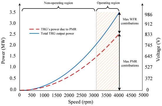 Figure 3 illustrates the region of operation for the propulsion system within the spacecraft, based on the TRG power, speed, and rectified DC voltage. The spacecraft’s NEP (Brayton cycle and turbine) provides a speed in the range of 3100 to 4000 RPM for the TRG, while the power may vary from 0 to 3.6 MW due to the varying demand of the electric thruster. As illustrated in Figure 3, the TRG’s output power has contributions from its PMR and WFR. The maximum PMR power is 2.5 MW, while the WRF provides the remaining power for the propulsion system, i.e., the region between the two curves in Figure 3. For completeness, Figure 3 shows the power curves for different speeds (0–4000 RPM); however, it is important to note that the propulsion system will only operate in a range of 3100–4000 RPM.