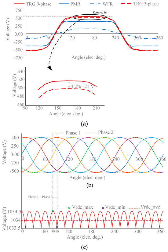 here, is the TRG’s phase-induced voltage and is the TRG’s phase-induced voltage. and denote the times when reaches its maximum and minimum values, respectively. The phase difference between these two times is 90° − 80° = 10° for a nine-phase full-bridge rectifier, as illustrated in Figure 4c. This figure illustrates a voltage ripple of less than 0.1% compared with 5% for a three-phase rectifier [2]. This leads to a significant reduction in smoothing DC capacitors.
