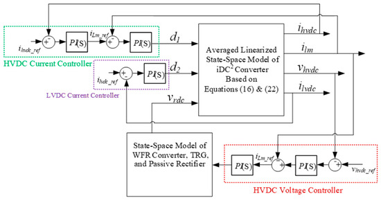 In order to develop the HVDC and LVDC controllers for the iDC2 converter that effectively respond to variable load the dynamic models of variables under control, i.e., the inductor currents, , , and capacitor voltages, , , with respect to the duty cycles of the two switches, and are derived. The system state-space model is expressed as: