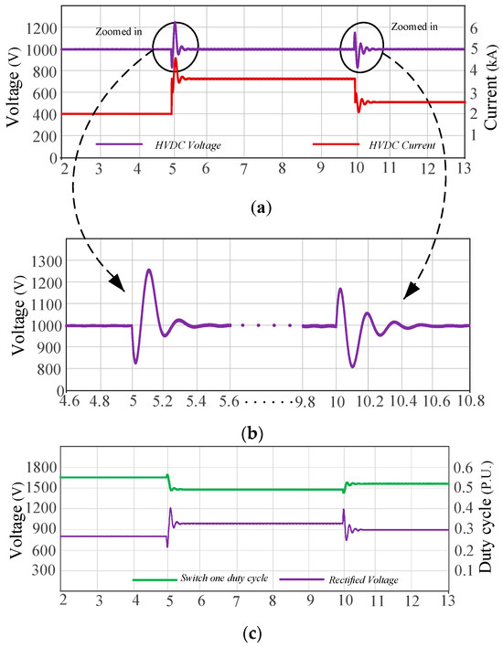Simulation results for HVDC controllers: (a) HVDC input voltage and current. (b) Zoomed-in plots of HVDC voltage. (c) Switch duty cycle () and rectified voltage after passive rectifier.