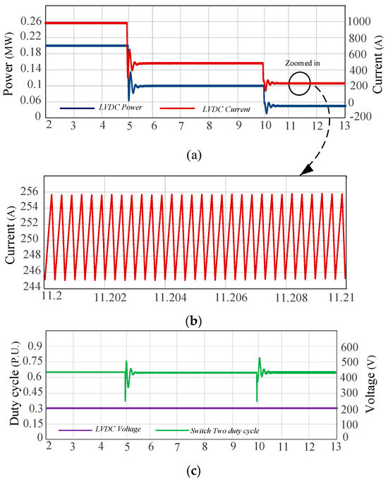 Simulation results for LVDC controller. (a) LVDC current and power. (b) Zoomed-in LVDC current, showing ripple. (c) LVDC voltage and switch duty cycle ().
