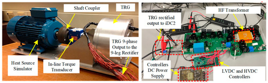 To evaluate the analytical design, a small-scale laboratory prototype experimental setup was developed as illustrated in Figure 9. The setup comprised (i) an induction motor that acts as a fixed-speed prime mover for the TRG, (ii) a scaled-down nine-phase TRG prototype built in-house from the previous work of the authors [35], (iii) a nine-phase passive rectifier that rectifies the output of the TRG, (iv) an iDC2 converter, (v) an Arduino programmed with the functionality of the proposed controllers tailored to support this scaled-down prototype to control the LVDC and HVDC outputs, and (vi) a DC power supply that emulates the spacecraft fixed LVDC bus. Designed for laboratory use, the prototype supports an iDC2 HVDC output rated at 140 V and a 20 V LVDC output, capable of sustaining a peak current of 25 A at 130 V.
