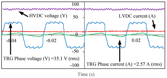 Under these conditions, the load on the iDC2 HVDC output is fixed at 750 W. It is observed that the HVDC controllers effectively sustain the output voltage at a targeted 75 V during load transitions. The fluctuations in HVDC voltage are the result of fluctuations in the TRG’s voltage at the peak, which is a contribution of the nine-phase winding, showing the moments the commutation changes between the diodes in the passive rectifier. The HVDC voltage and LVDC current show ripples of less than 0.05 p.u., demonstrating that the components of iDC2 are designed effectively for this laboratory prototype. This stability is attributed to the rotor’s consistent position, ensuring the back-EMF remains constant. The TRG phase current and phase voltage (total of the PMR and WFR at each phase) also denote the power generated by the TRG, which is in total = 9 × ≈ 950 W (as the generator winding is designed for nine phases) [46], equating to the sum of output powers, as indicated in Table 4. This equality confirms the functionality of the nine-phase operation. The data demonstrate that the controllers are proficient in maintaining their designated outputs at the considered operating point (O.P.) for this test.