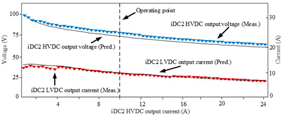 Figure 11 displays the actual measurements alongside the predicted results for the iDC2 outputs under various loads (different O.P.). This graph depicts the load variation through the HVDC output current, ranging from no load to a maximum of 25 A DC. During this testing, we aim to keep the power from the TRG under 2 kW as introduced as the rated power in Table 4. As observed, when the HVDC current increases, the HVDC voltage decreases, while the LVDC current decreases accordingly to avoid surpassing the power limitations of the system. This figure aims to showcase the system’s capability under various HVDC loads, demonstrating that as the HVDC load increases, the system can allocate less power to the LVDC load. Note that for this test, iDC2 does not attempt to maintain HVDC voltages at a constant value. Instead, it adjusts them to the desired value to remain within the system’s capability. The matching outcomes between the simulations and the actual measurements in Figure 11 also provide confirmation that the design, models, and proposed controllers are functioning correctly.