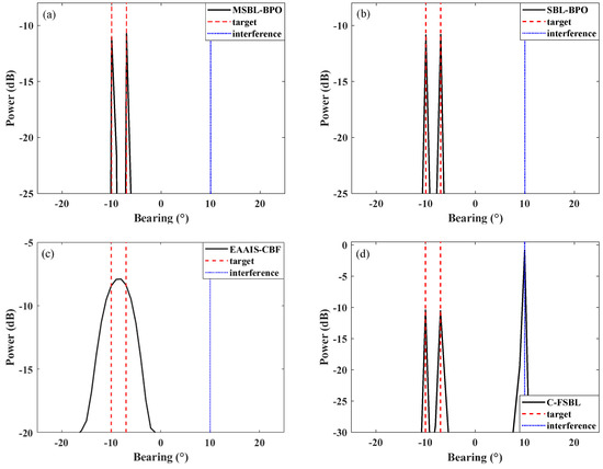 The spatial spectra of (a) MSBL-BPO, (b) SBL-BPO, (c) EAAIS-CBF, and (d) C-FSBL with the SIR of −10 dB. Two dashed lines represent the directions of the targets, and the dotted line shows the direction of the interfering source.