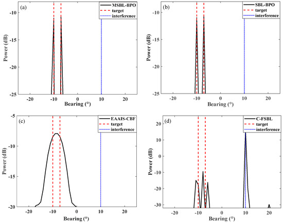 Figure 1 shows the spatial spectra of the abovementioned algorithms with SIR of −10 dB. The SNR and the number of snapshots N are set to −10 dB and 50, respectively. Under such a condition, the MSBL-BPO, the SBL-BPO and the C-FSBL as super-resolution methods, can estimate the two directions of the targets. On the contrary, though the EAAIS-CBF can suppress the interference by removing the interference subspace from the covariance matrix, it still cannot resolve the directions of signals because of the wide main lobe, which results in low resolution.